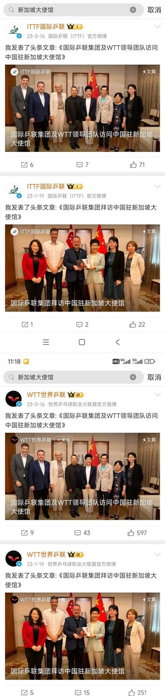 然而细思极恐的是,据知名记者杜立言报道,过去与中国驻新加坡大使馆会见的时候,担任WTT代表并且站在C位的人物是刘国梁,而如今在这个节骨眼上,WTT首席执行官史蒂夫·丹顿未必不想获得更大的权力,所以有好戏看了!至于杜立言所说的“这个节骨眼”,相信大家都明白,于是我去查找了资料,果不其然在2023年,无论是代表国际乒联还是WTT(世界乒联),刘国梁都是站在C位的第一人物,并且这次刘国梁不仅缺席了,就连WTT会见中国驻新加坡大使馆这则新闻,都第一次未被国际乒联和WTT(世界乒联)报道,这些细节不得不让更多人产生怀疑