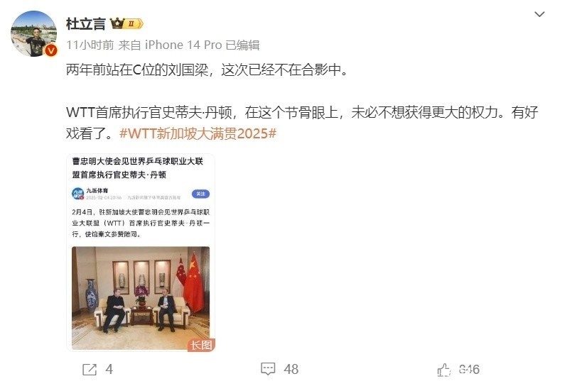 乒乓球WTT新加坡大满贯赛正在火热进行中,而作为赛事的承办方WTT(世界乒联)也依据过往习惯与中国驻新加坡大使馆会见,那么为什么WTT作为国际组织会依照惯例会见中国驻新加坡大使馆呢,一方面是中国乒乓球在WTT的核心地位,另一方面则由于WTT董事会主席是刘国梁的缘故,然而今年却异常奇怪的是,虽然WTT依然与中国驻新加坡大使馆进行了重要会见,但会见的第一人物却不再是刘国梁,而这一细节也被众多媒体人捕捉到了,其中知名记者杜立言就直言:这下有好戏看了!