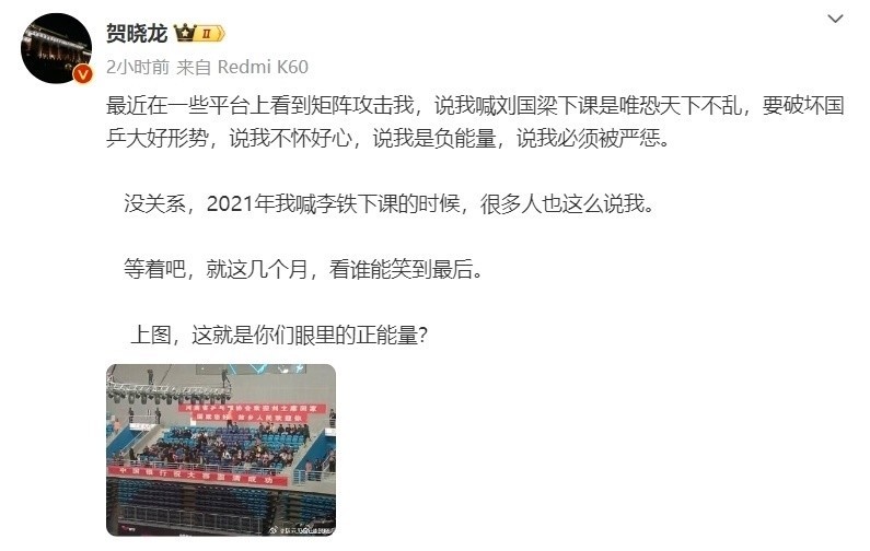 除此之外,另外一位长期“倒刘”的知名媒体人贺晓龙同样在社交平台上发表相关言论,他声称近期有很多人在各大平台攻击他,抨击他“喊刘国梁下课是唯恐天下不乱,要破坏国乒大好形势,并且所有言行不怀好心、带有负能量,必须得到严惩!”而贺晓龙声称,在2021年他暗示李铁要下课的时候,同样是一群人这么说他的,所以大家等着吧,就这几个月,看谁能笑到最后!按照贺晓龙的说法以及WTT与中国驻新加坡大使馆会见的细节,不知道贺晓龙所说的“几个月”,是不是有所大事发生